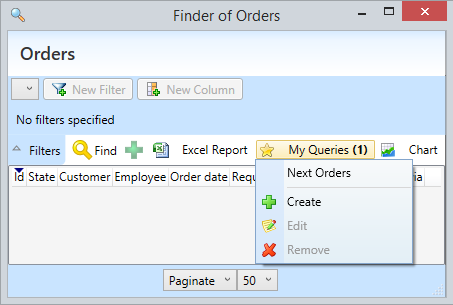 • Add and remove filters for any reachable column, using the right set of operations depending of the column type